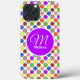 Personalised colourful, rainbow polka-dotted phone case. Watermelon, strawberry, blue raspberry, pink grapefruit, orange, lemon yellow, lime green, grape jelly fruit candy polka dots on white. Personalise this phone case with your name and initial.