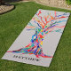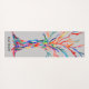 This brightly coloured yoga mat is decorated with a mosaic tree in rainbow colours on a grey background.