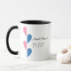 The custom coffee mug showcases pink and blue half hearts, along with up to four typography fields for names, titles, or messages. Currently, it displays "Best MOM Ever!" and "Best DAD Ever!" in an elegant and adorable design. This personalised mug is a perfect and thoughtful gift for coffee lovers, especially parents, grandparents, newlyweds, or couples celebrating anniversaries or special occasions.