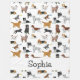 A design for dog lovers. It features illustrations of golden retrievers, border collies, Jack Russell terriers, spaniels, basset hounds, beagles, Dalmatians, golden doodles, Labrador retrievers, and mixed breeds. Personalise with the name of your choice, which will appear in a fun, black font.