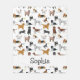 A design for dog lovers. It features illustrations of golden retrievers, border collies, Jack Russell terriers, spaniels, basset hounds, beagles, Dalmatians, golden doodles, Labrador retrievers, and mixed breeds. Personalise with the name of your choice, which will appear in a fun, black font.