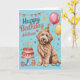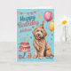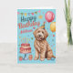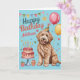 This adorable personalised goldendoodle birthday card design includes a cute watercolor goldendoodle dog graphic, as well as a birthday cake and birthday decorations. The background colour is blue. The front of the birthday cards includes a place where you can personalise with your name as well as the words "Happy Birthday". The message on the inside of the card says "Hope your birthday is paws-itively amazing!"