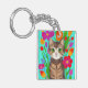 Personalised Cute Grey Cat with Colourful Flowers Key Ring