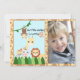 An adorable and personalizable birthday party invitation for kids with a safari theme and a giraffe patterned background, featuring a monkey hanging from a vine, a giraffe, a zebra, and a lion.