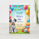 A cheerful and colourful birthday invitation featuring a playful cartoon Dalmatian puppy seated among wrapped presents, a soccer ball, and toys. The background is bright white with festive pastel decorations including balloons, confetti, and a string of triangular pennant flags across the top. The overall aesthetic is light, joyful, and kid-friendly. Text is centred and cleanly laid out in a mix of modern sans-serif and playful script fonts, with placeholders for name, age, date, time, location, and RSVP details.