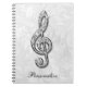 Elegant, glamourous personalised Notebook. Beautiful, dazzling trendy printed image silver and glitter diamonds bling jewels musical note on a chic white floral damask pattern background. A cute, classy, fashionable, stylish, pretty gift for her or any music lover. Women and girls will love this pretty case.