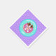These custom birthday party napkins feature Sophie, a brown and white cartoon dog, relaxing on a inflatable pool float in the shape of a doughnut. Sophie is wearing sun glasses and is wearing a pink swimsuit with a pineapple design on it. Party napkins have a wavy pattern and sparkles as accents. The party plate has tones of aqua blue, purple, bright pink, white and mint green.