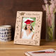 A charming engraved wood graduation frame featuring playful hand-drawn doodles including a graduation cap, diploma, stars, hearts, flowers, and confetti surrounding the photo opening. The graduate's name is engraved in script at the top with the school name and class year below. A heartfelt keepsake gift that celebrates your graduate's milestone in unique, personalised style.