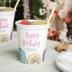 Cute dessert themed birthday paper cups feature pastel watercolor doughnut illustrations with "happy birthday [name]" in pink and aqua lettering.
