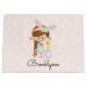Personalise this cute girl with wearing a blue rose floral bunny ears headband, pink shoes, ribbon and blue Easter dress standing next to a sweet chick on top of a light purple dyed Easter egg with a daisy on it. Choose a girl that looks like you. A sweet brown haired girl with a braid shown. This personalised Easter gift bag makes a cute and custom alternative to an Easter basket to surprise a special someone. Artwork © Chrissy H. Studios, LLC