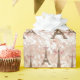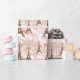 This beautiful Eiffel Tower wrapping paper design features a brown graphic of the Eiffel Tower on a rose gold and white marble background.