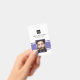 Personalised business office ID badge featuring a purple and white background, a photo of the employee, your company logo, name and profession.