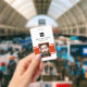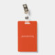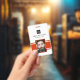 Personalised business office ID badge featuring a red and white background, a photo of the employee, your company logo, name and profession.