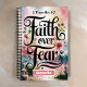 A watercolor landscape at dawn, with pastel skies and delicate florals surrounding the phrase "Faith Over Fear" in elegant calligraphy. personalised with name.