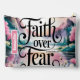 A peaceful watercolor landscape at dawn with soft pastel skies, featuring the inspirational phrase "Faith Over Fear" in elegant calligraphy. personalised with name.