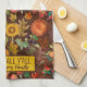Personalised Fall Autumn Botanical kitchen towel with sunflowers, berry leaves, foliage and pretty fall patterns. Happy Fall Y'all or other custom greeting and family name or person's name.
