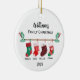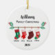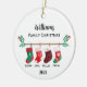 A cute family Christmas ornament with four stockings that you can personalise with your family name at the top and four names under the stockings.