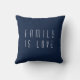 A navy and white personalised throw pillow. Keep the saying Family is Love or change it and personalise the two lines of text.