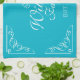 Personalised family name established kitchen towel. Turquoise blue towels with elegant ornate flourish swirly swirls. Classy home decor for husband and wife couple / newly weds. Elegant monogrammed design for men and women. Stylish script calligraphy typography with personalised surname. Cute personalised gift idea for wedding, engagement, baby shower, new baby, anniversary, birthday, housewarming party, reunion etc. Pretty chic interior decoration for new house. Make your own with your last name and custom established year. Est. 20XX.