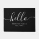 Elegant personalised family name doormat featuring your family name with your established date set in classic white text on a black background with the message "hello" that is set in an elegant white script text. Personalise with your details and customise the colour to the colour of your choice. Designed by Thisisnotme©