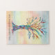 This modern jigsaw puzzle is decorated with a colourful Family Tree design on a watercolor background.