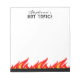 Personalised red fire flames hot topic writing memo notepads fr home or work. Custom note pads with flames and name. Personalised memo pad design for home, club, kitchen, school or office. School / office supplies for men, women and kids. Customisable background colour. Cute gift idea for dad, teacher, chef, restaurant owner, mum, friend, co worker, boss, colleague, etc.