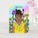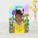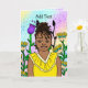 Pretty hand drawn artsy folk art whimsical girl of colour with yellow and purple flowers in the background. Inside of card is blank to write whatever messages you want such as Happy Graduation, Congrats on New Job or whatever it is that is making you feel proud.