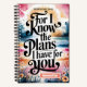 A serene and spiritual illustration of the text "For I Know the Plans I Have for You" in elegant, bold calligraphy. The phrase is beautifully encircled by watercolor fields of pink, orange, and blue, blending harmoniously. A soft sunrise illuminates the background, casting a peaceful glow over the scene.personalised with name.