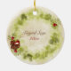 The baby's first Christmas ornament features an adorable woodland fox with his red bird friend. They are sitting in a holiday wreath decorated with pine cones and holly. This ornament can be personalised with a name and date. *