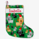A Christmas stocking for any dog lover, this cute design features an illustration of many orange, grey, and black dogs in a variety of sizes, wearing red Santa hats, on a green background. Makes a fun gift for dog lovers and for kids. Personalise with the name of your choice on the white band near the top of the stocking.