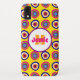 This bright yellow cell case cover has a colourful pattern of circles, circles, and more circles in hot pink, orange, green, purple, blue, navy, and burgundy. Customise the white and purple circle with your name, initials, monogram, or other wording. Make the circle and name as big or little as you like, or remove it completely.