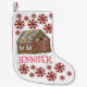 Christmas stocking features an original illustration of a candy-covered gingerbread house, surrounded by red and white peppermint "starlight mint" candies. Simply personalise with your name for a unique holiday decoration!