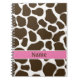 This cute brown, hot pink and white notebook features a giraffe print and the name or text of your choice.