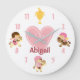 This pretty pony pink heart wall clock is perfect for all girls who love horses and ponies. Features cute little girl riding ponies with English tack and a trophy on top. Personalised with a name or any text that you wish to add.