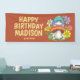 Personalised Girls Frogs Birthday Banner. This design has a cute frog flowers, and mushroom design. Great birthday decor for a Frog themed birthday party.