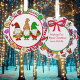 An adorable Christmas ornament and gift tag that can be personalised. Cute hand drawn gnomes and Christmas candy, snowmen and penguins. Colourful with red, green and purple.