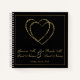 This exquisite wedding guest book features customisable typography fields for the bride and groom's names and wedding date personalisation. The elegant design is adorned with two ornate, interlocking hearts, symbolising the union of two souls. The guest book is presented in a timeless golden and black theme, adding a touch of sophistication and charm to your wedding celebration.