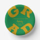 GRAD in bold gold lettering curves around the edges of these green graduation paper bowls personalised for your graduate - perfect for serving snacks, salads, desserts and more. MATCHING items and more pre-done colour combinations in our store.