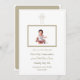 Celebrate your child's First Holy Communion with this elegant and customisable invitation. The design features a gold-accented cross at the top, symbolising faith, and a central framed photo of your little one, making the card truly personal. The white background and refined gold text lend a clean and sophisticated look, while the blend of script and serif fonts adds a classic touch. Perfect for creating a cherished memory of this special occasion.