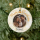 Celebrate the season with this exquisite personalised Christmas ornament featuring a soft white background adorned with delicate gold snowflake patterns. At its centre is a customisable circular photo frame bordered by a subtle gold ring, perfect for showcasing a cherished family portrait. "Merry Christmas" is elegantly written in gold cursive along the top edge, adding a festive touch. Below the photo, personalise with your family name and member names for a unique keepsake. A gold ornament hook and bow detail complete the design, making it an elegant and heartfelt addition to your holiday décor.