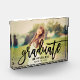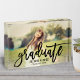 A striking graduation photo block featuring a full senior portrait with Graduate in bold black brushed script across the design and the graduate's name and class year in clean serif type. The high-contrast script creates a modern, statement keepsake. Customise with a favourite portrait and details for a personalised graduation gift or desk display.