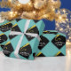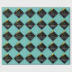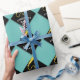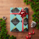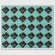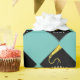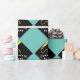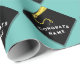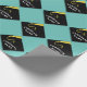 Creative graduation gift wrap or party decor featuring black and gold grad cap on teal blue background. To personalise edit text to add name or otherwise customise.