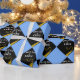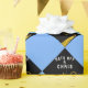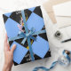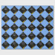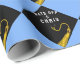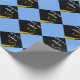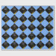 Grad gift wrap or graduation party decoration featuring black cap with gold tassel on a light-blue background. Edit text to add his or her name.