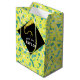 Graduation gift bag featuring creative grad cap design, congrats, yellow and teal blue confetti. To personalise edit text to add his or her name.