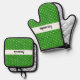 Pretty green and white dot design on this oven mitt and pot holder set. Personalise with your name or the couple's names.