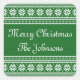 Personalised square UGLY CHRISTMAS SWEATER stickers. Funny green and white nordic snowflake fair isle knitting design. Add your own family name and seasons greetings message like Merry Christmas. Glossy finish. Also handy as envelope seals / sealers for party favours and presents. Script typography.