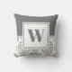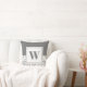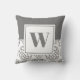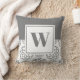 A chic and funky personalised throw pillow. Grey monogram in a double white block. In the background is grey on the top half and a grey and white circular geometric pattern on the bottom. Fun and fantastic!