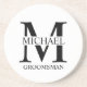 featuring personalised groomsman's monogram, name and title in black classic serif font style on white background.
