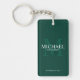 This keychain features personalised groomsman's name with title and wedding date in white and monogram in light emerald green as background, in classic serif font style, on emerald green background.