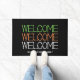 Simple, personalised Halloween WELCOME mat with CUSTOMIZABLE name. The word WELCOME is repeated in white, orange and green skeleton bone typography, with a rich black background.